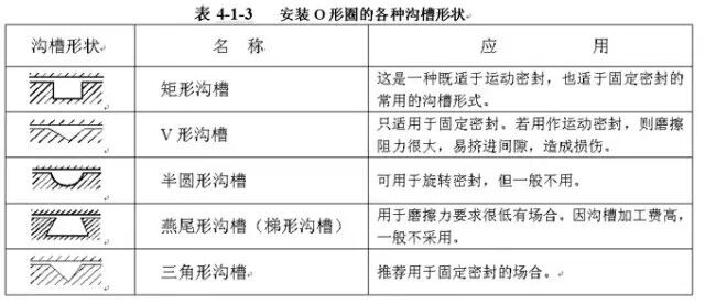因為O形橡膠密封圈是安裝在各種溝槽中使用,現將安裝溝槽情況列于表4-1-3。